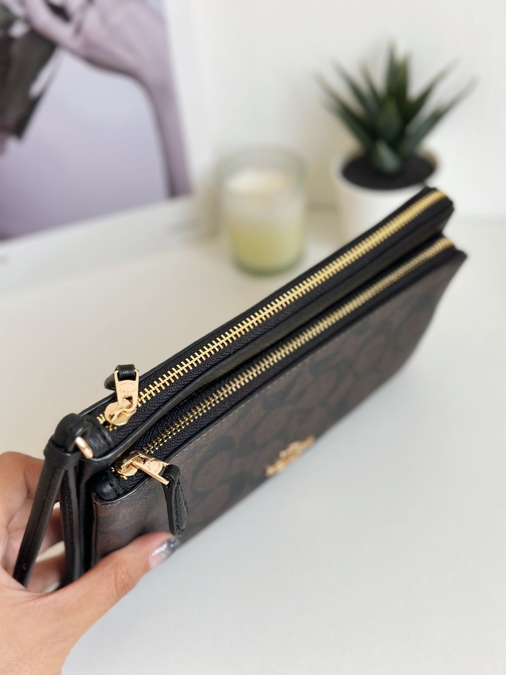 COACH C5576 / CU920 SIG PVC DOUBLE ZIP WRISTLET WALLET BLACK BROWN
