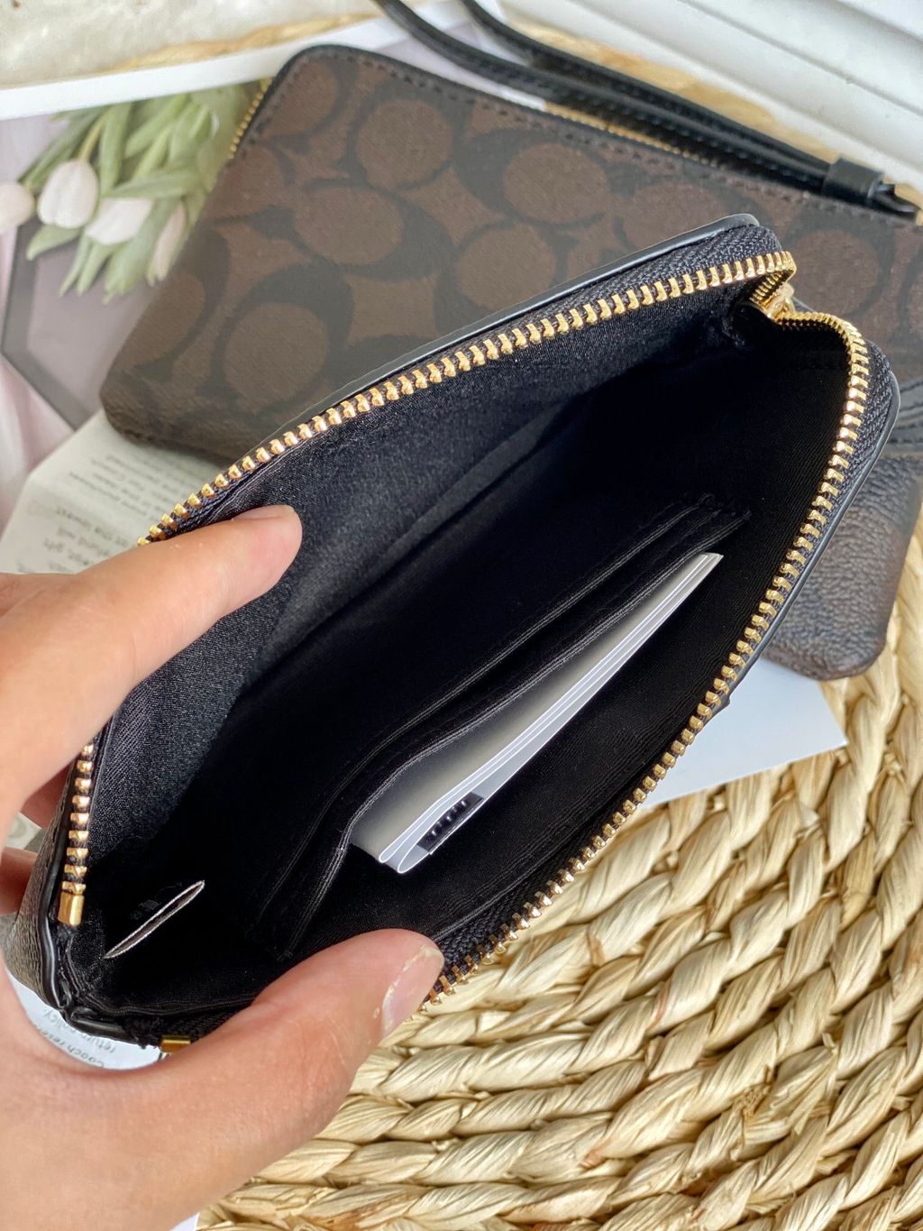 Signature coated canvas and smooth leatherTwo credit card slotsZip-top closure, fabric liningWrist strap attachedMeasure Approx.6 1/4" (L) x 4" (H) x 1/2" (W)