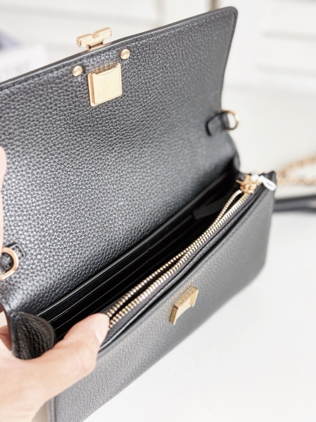 - Exterior: Pebbled leather, gold-tone double-T logo, detachable chain strap, detachable wristlet strap