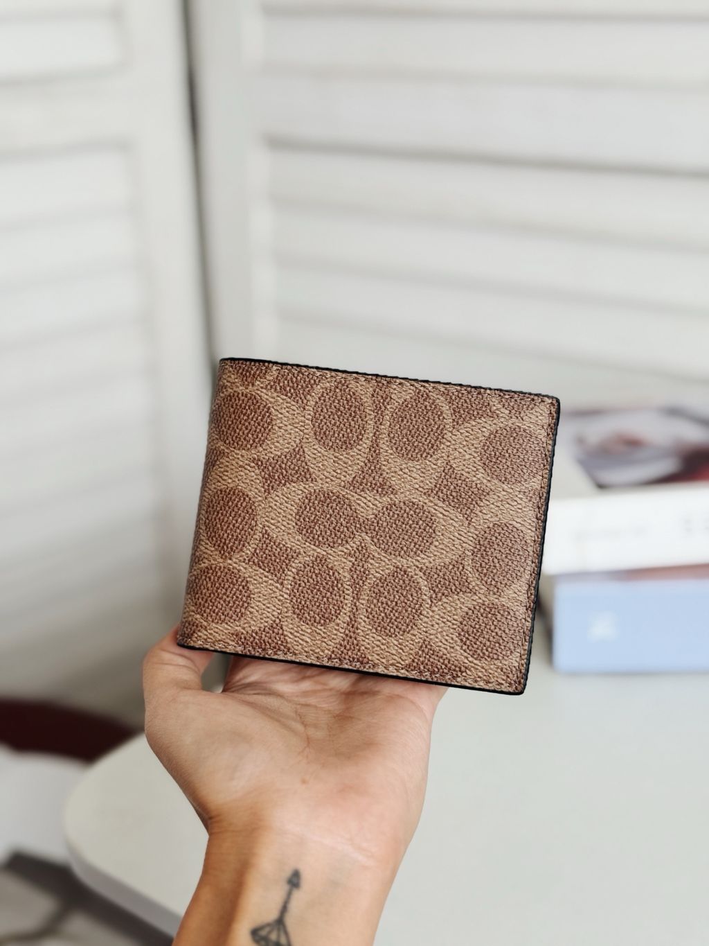 COACH CY394 ID BILLFOLD WALLET IN SIGNATURE CANVAS TAN/BLACK