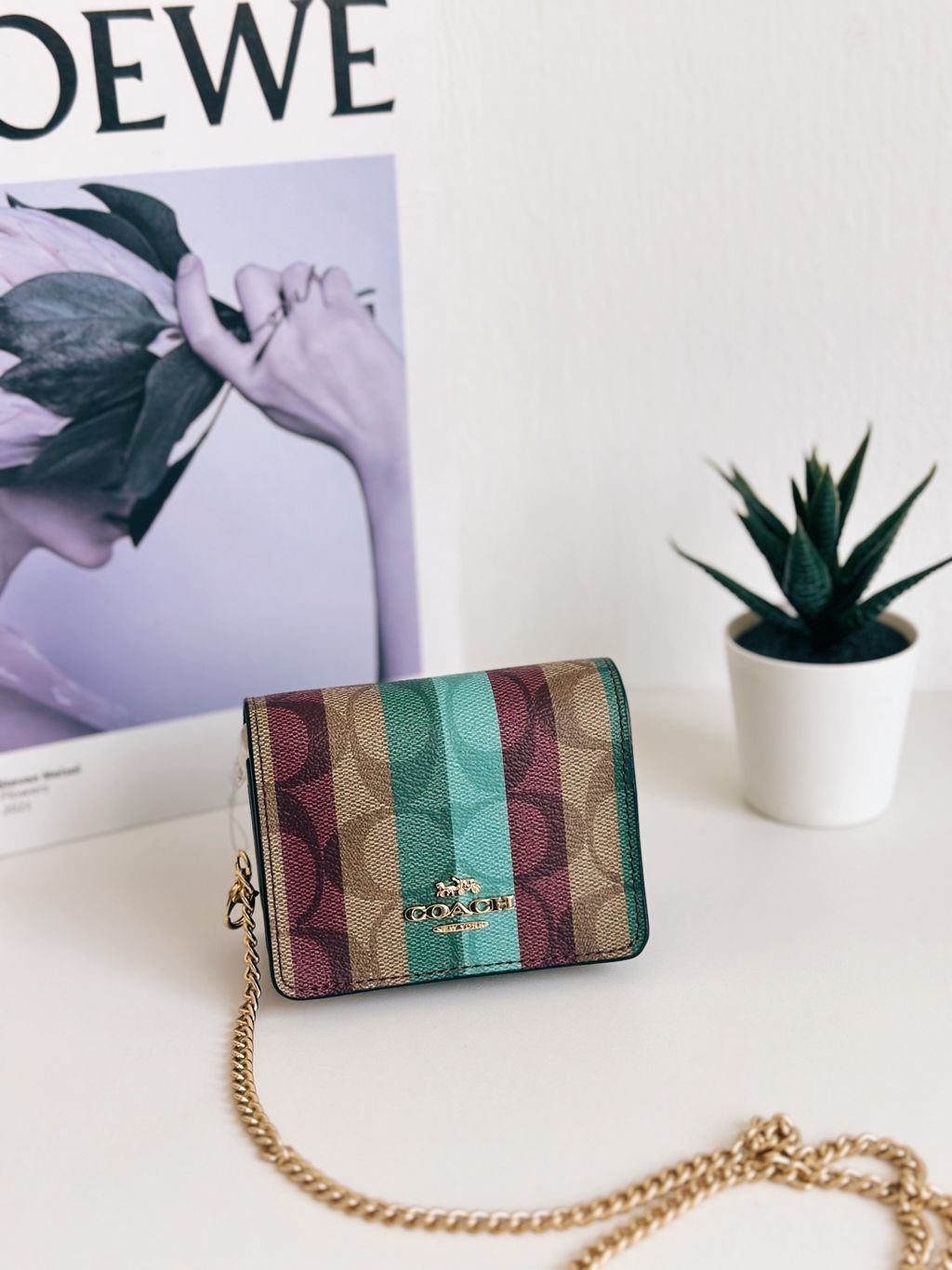 Signature coated canvas and smooth leather| Two credit card slots| Snap closure, fabric lining| Outside open pocket| Detachable chain strap with 23 1/4" drop for shoulder or crossbody wear| 4" (L) x 3" (H) x 1" (W)Style No. C6127