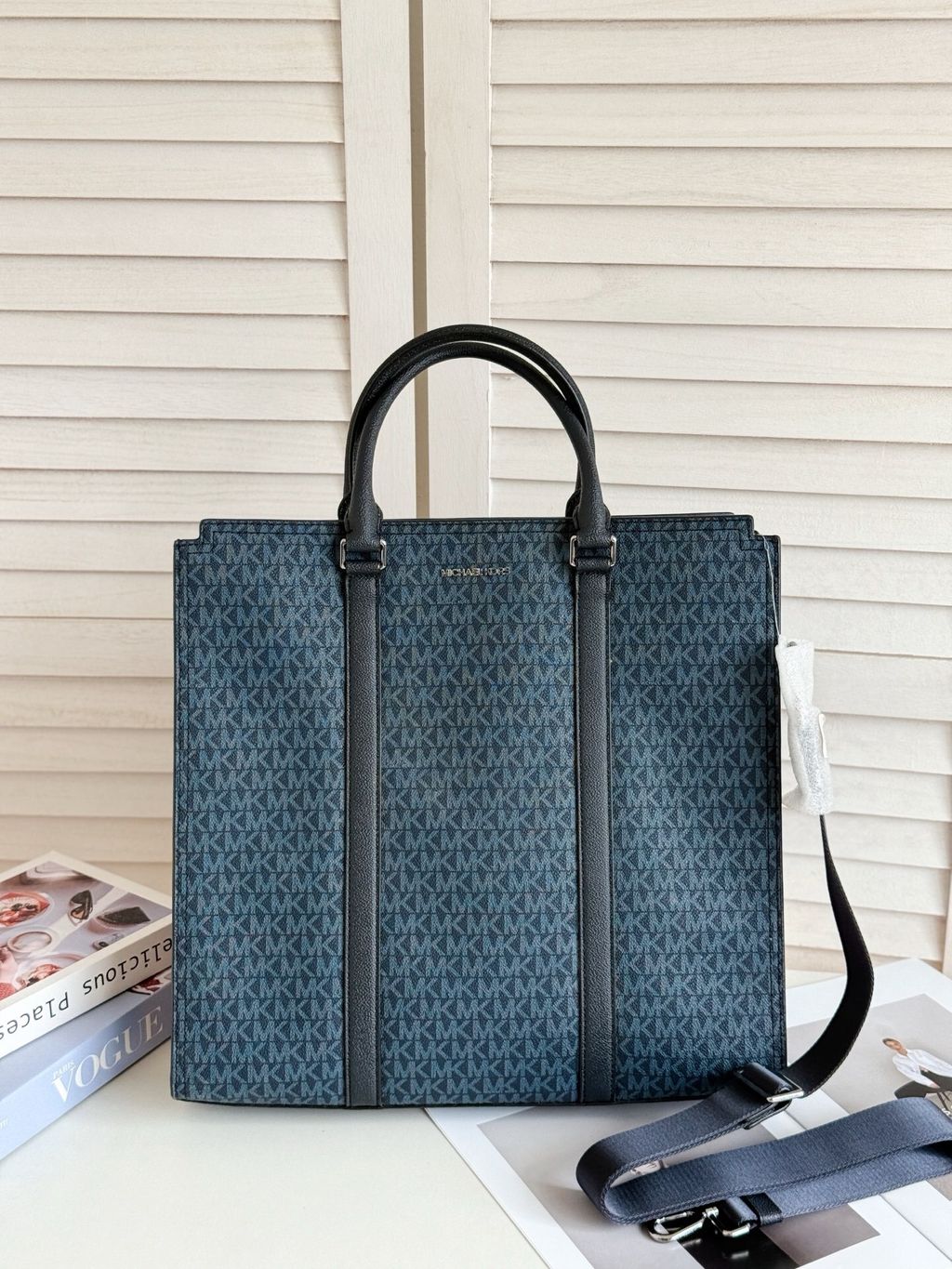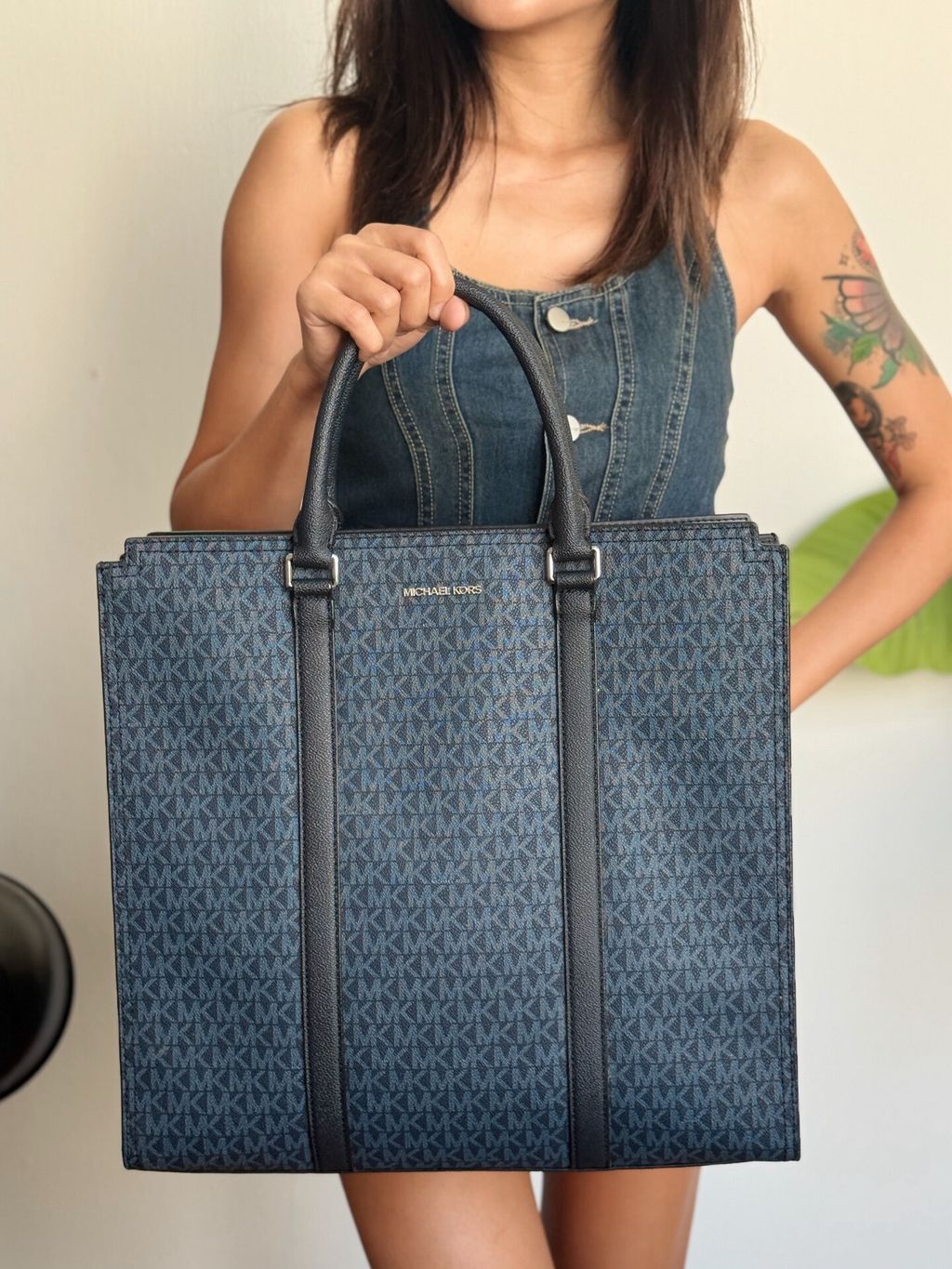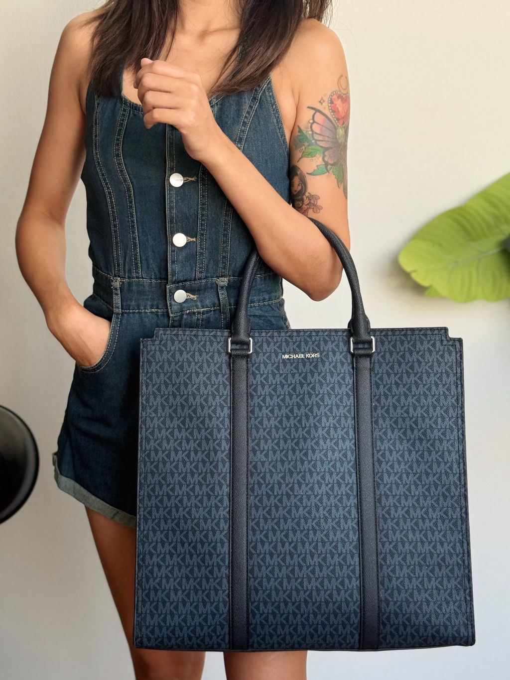 MICHAEL KORS SIGNATURE COATED CANVAS AND LEATHER COOPER TOTE IN BLUE/BLACK