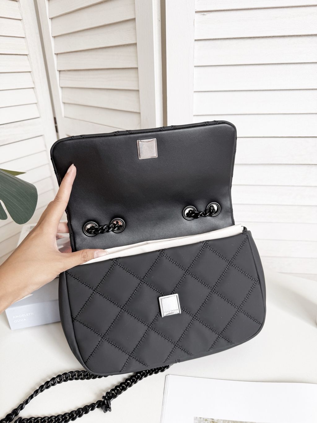 Hardware logo on front, back slip pocket, large diamond quilting accent